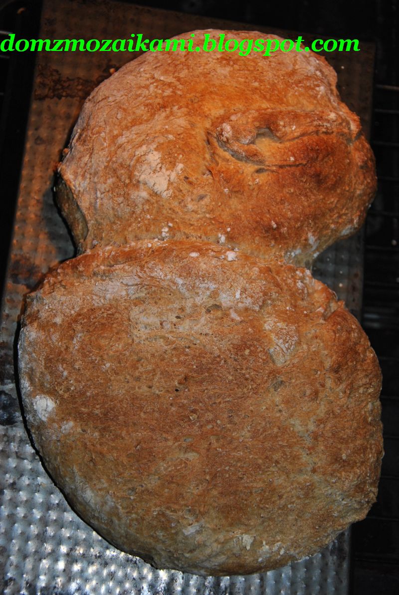 Wodę wymieszać z drożdżami, dodać zaczyn ze słoika, wsypać mąkę , otręby i cukier. Wyrabiać ciasto starannie (używałam robota kuchennego ), wsypać sól i kminek i teraz już ręcznie uformować kulę i odstawić na 20-25 min (ciasto wstawiłam do miski i przykryłam ściereczką). Potem podzieliłam je na dwie części wg w/w przepisu ale ciasto ” rozpełzło” mi się po blacie, więc ” przerobiłam” je ponownie i uformowałam po prostu kule, które włożyłam do dwóch misek -dla powstrzymania amebowych zapędów- Wyrastały w nich ok 90 min. Na pierwszy od dołu poziom wstawiłam kratkę do pieczenia, a na nią blachę (spodem do góry) i nagrzałam piekarnik do 230 st. C. Na taką gorąca blachę wytrzęsłam z misek dwa uformowane chlebki *. Psiknęłam je dla otuchy wodą ze spryskiwacza (i trochę po ściankach piekarnika również). Po 10 minutach pieczenia zmniejszyłam temperaturę do 220 st. C, a po następnych 10 min.do 200 st. C. Łączny czas pieczenia to ok. 35 minut. Chleb wyjęłam gdy ładnie się zrumienił, a przy stukaniu w jego spód wydawał głuchy odgłos.