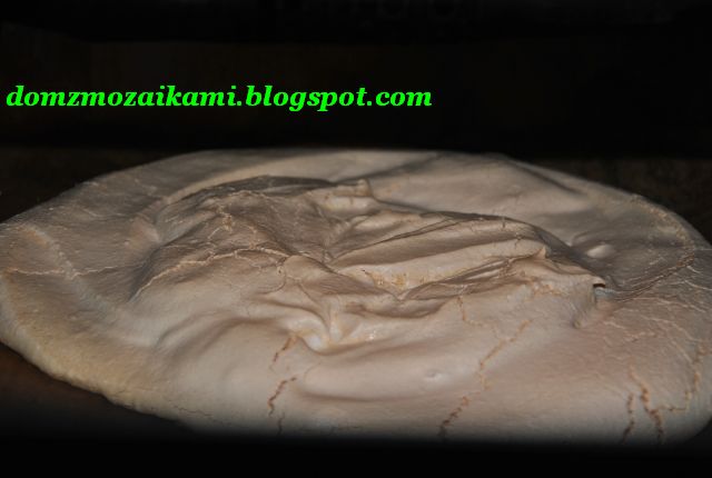 3 białka ubić na sztywno i wsypać 25 dkg zwykłego cukru, dodać 1 łyżkę mąki ziemniaczanej, a po chwili 1 łyżeczkę soku z cytryny. Masę rozsmarować na papierze do pieczenia . Wstawić do piekarnika nagrzanego do 140 st. C , na 50 minut (jeśli jest płaska i niewysoka, a 60 minut jeśli jest wyższa).